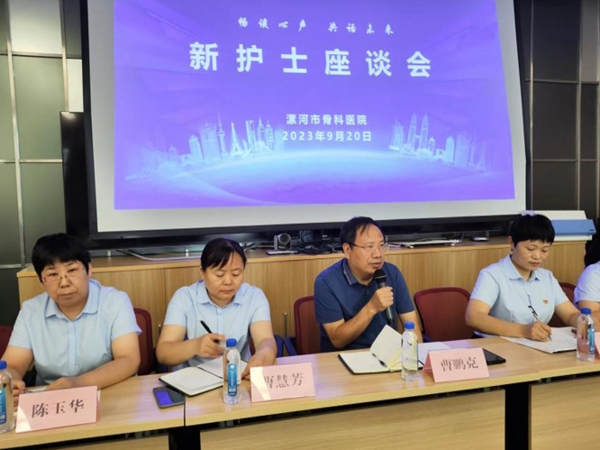 為加強醫(yī)院護理隊伍建設(shè),了解年輕護士思想動態(tài),引導(dǎo)新護士成長,凝聚新生力量,切實解決他們在工作中遇到的問題和困難,近日,漯河市骨科醫(yī)院(漯河醫(yī)專二附院)護理部舉辦新護士座談會。副院長曹鵬克、護理部副主任趙春紅、曹慧芳、王爽及科室護士長代表出席會議,會議由護理部副主任王爽主持。