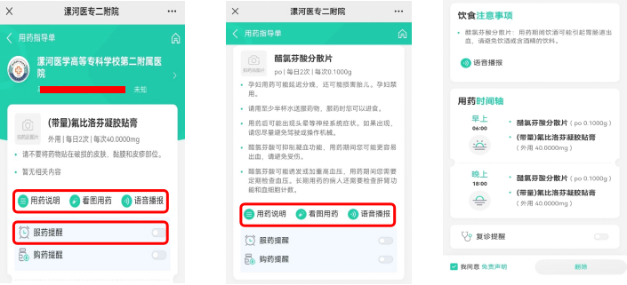 小程序同時(shí)具備語音播報(bào)、看圖用藥、服藥提醒等功能,可滿足老年人、視障人士等不同人群的個(gè)性化需求。醫(yī)院也可利用官方微信公眾號(hào)、小程序等平臺(tái)向患者推送用藥指導(dǎo)信息,為患者提供用藥教育、用藥科普等服務(wù),指導(dǎo)督促患者規(guī)律服藥。