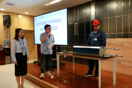 本次大比武由水、電、中央空調(diào)三個班組參賽,比賽項目及內(nèi)容分別為:電工班帶電情況下的作業(yè)設(shè)計與安裝;空調(diào)班風(fēng)機(jī)盤管的拆除與安裝;維修班的主干管道接分支管道。以上三個比賽項目及內(nèi)容均為后勤崗位基本操作技能。每個項目設(shè)一、二、三等獎各一名,六名評委依據(jù)評分標(biāo)準(zhǔn)打分評定;活動還邀請了安裝工程專業(yè)的宋龍濤監(jiān)理工程師作為特邀評委為參賽選手進(jìn)行打分與點評。