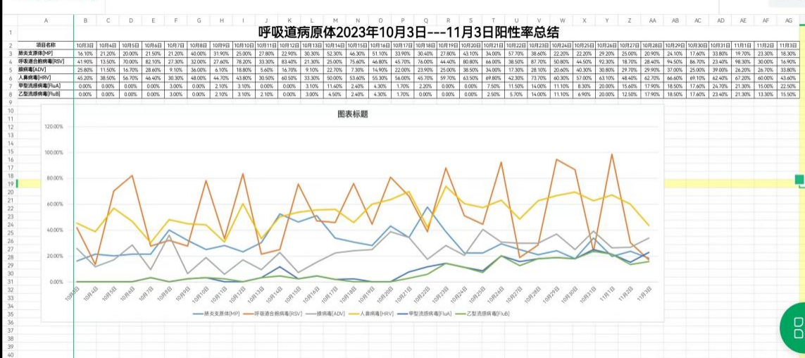 為應對兒童就診高峰,市二院全面落實市衛(wèi)健委要求,在迅速增設病區(qū)、增開白天及夜間兒科專家門診同時,醫(yī)院檢驗科、兒科、急診等相關科室統(tǒng)計了10月以來呼吸道病毒檢驗數(shù)據(jù)及結果,分析發(fā)現(xiàn)10月17日后平均每日送檢量約是之前的兩倍,提示呼吸道感染患者較前翻倍趨勢。支原體感染陽性率逐日攀升,至10月22日達到頂峰,陽性率最高達57.7%,之后呈逐漸下降趨勢。大約同時期,甲型流感/乙型流感陽性率開始上升,并于10月31日達到陽性率頂峰,分別為24.7%和23.4%。往年乙型流感陽性率極低,今年陽性率與甲流持平,提醒我們需要同時對流感保持警惕。呼吸道合胞病毒與人鼻病毒陽性率一直普遍較高,如呼吸道合胞病毒陽性率最高達98.3%。