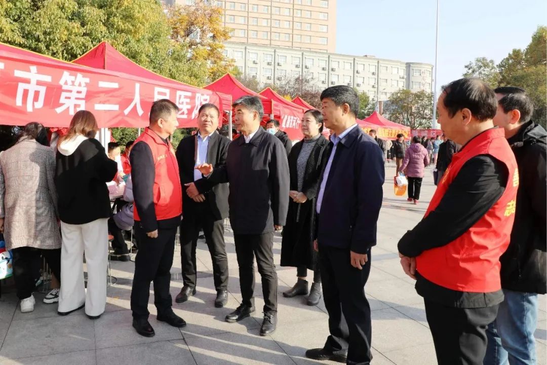 為深入貫徹落實(shí)黨的二十大精神,助力鄉(xiāng)村振興和文明漯河、健康漯河建設(shè),11月28日上午,“健康漯河行·大醫(yī)獻(xiàn)愛心”鄉(xiāng)村振興志愿服務(wù)專項(xiàng)行動暨“健康漯河”行動啟動儀式在郾城區(qū)黃河廣場舉行。市衛(wèi)健委黨組書記、主任宋耀生蒞臨市二院義診活動現(xiàn)場,在市二院黨委書記魏松、紀(jì)委書記孟德陽陪同下,親切慰問義診專家,并提出工作希望與要求。