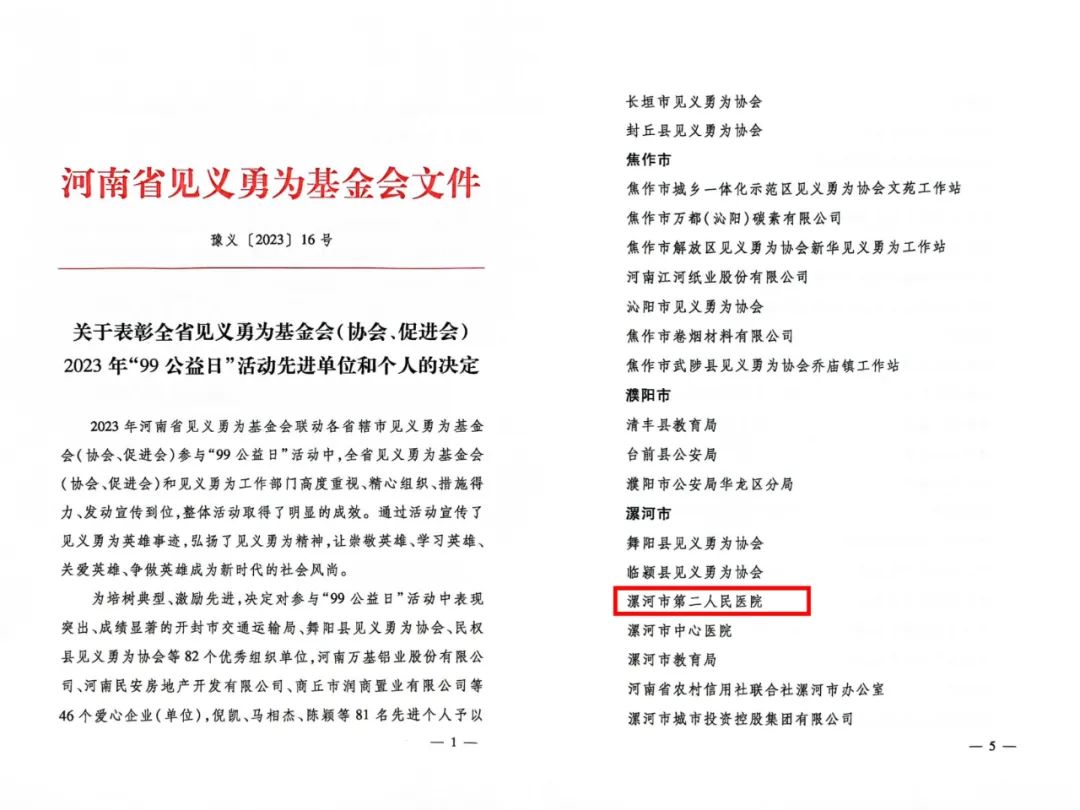 市二院榮獲全省2023年“99公益日”活動先進單位