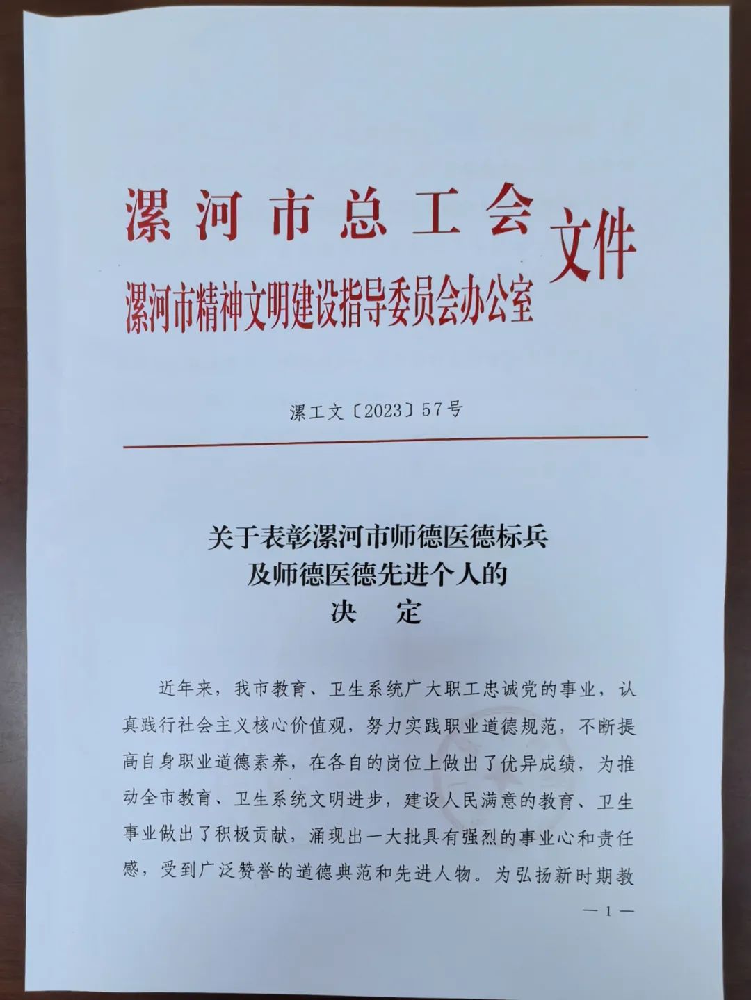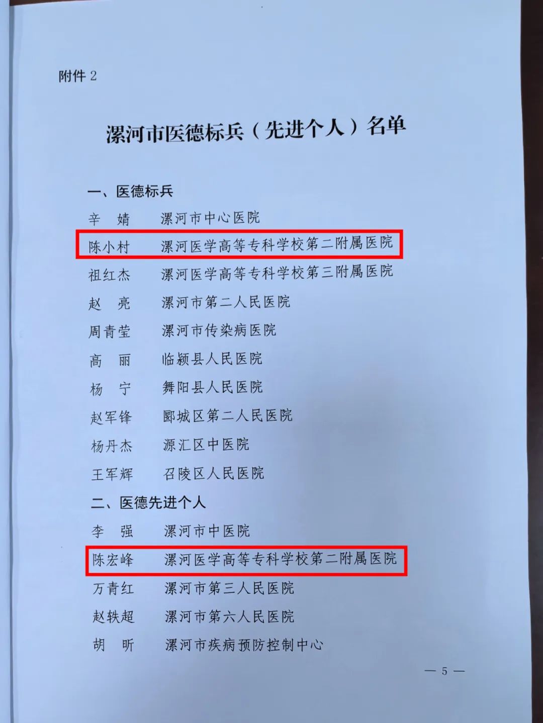 為推動(dòng)全市教育、衛(wèi)生系統(tǒng)文明進(jìn)步,建設(shè)人民滿(mǎn)意的教育、衛(wèi)生事業(yè),進(jìn)一步激勵(lì)教育、衛(wèi)生系統(tǒng)廣大職工不斷開(kāi)創(chuàng)中國(guó)式現(xiàn)代化建設(shè)漯河實(shí)踐新局面努力奮斗,近日,漯河市總工會(huì)、漯河市精神文明建設(shè)指導(dǎo)委員會(huì)辦公室聯(lián)合發(fā)布了《關(guān)于表彰漯河市師德醫(yī)德標(biāo)兵及師德醫(yī)德先進(jìn)個(gè)人的決定》,漯河市骨科醫(yī)院(漯河醫(yī)專(zhuān)二附院、漯河市立醫(yī)院)耳鼻咽喉科主任陳小村獲得“漯河市醫(yī)德標(biāo)兵”榮譽(yù)稱(chēng)號(hào),足踝外科主任陳宏峰獲得“漯河市醫(yī)德先進(jìn)個(gè)人”榮譽(yù)稱(chēng)號(hào)。