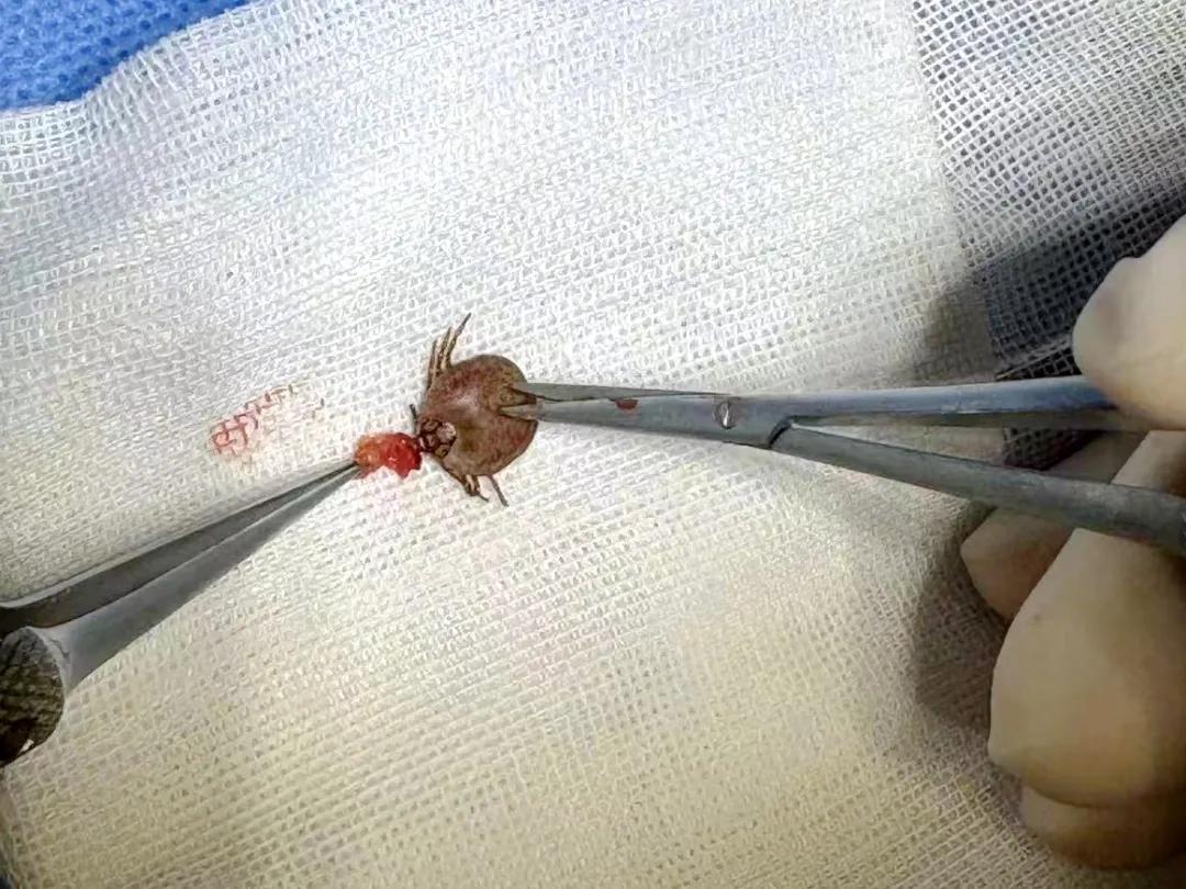44歲的馬女士,3天前曾在南陽山地茶園采摘春茶,不知不覺中被蜱蟲咬傷右側(cè)大腿內(nèi)側(cè),因局部疼痛,同行人員幫忙查看發(fā)現(xiàn)有一個(gè)黑色的“小圓粒”,以為是皮膚上長了疣,后來發(fā)現(xiàn)異物長有多條腿,并且會(huì)蠕動(dòng)。因此種情況不是十分常見,馬女士回家后輾轉(zhuǎn)多家醫(yī)院診治均無法取出。