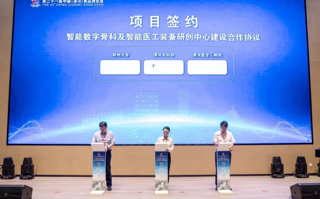 開(kāi)幕式現(xiàn)場(chǎng),漯河市骨科醫(yī)院(漯河醫(yī)專二附院、漯河市立醫(yī)院)黨委書記柴運(yùn)洪與鄭州大學(xué)機(jī)械與動(dòng)力工程學(xué)院院長(zhǎng)、教授高建設(shè),漯河市科協(xié)黨組書記、主席李志輝簽訂了智能數(shù)字骨科及智能醫(yī)工裝備研創(chuàng)中心建設(shè)合作協(xié)議。