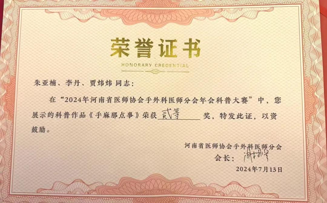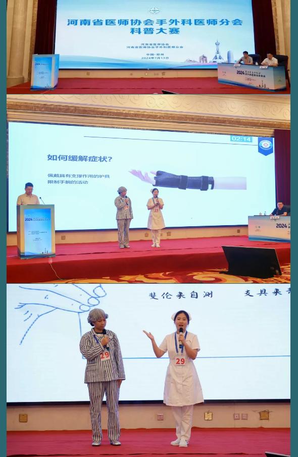 下午,在“2024年河南省醫(yī)師協(xié)會(huì)手外科醫(yī)師分會(huì)年會(huì)科普大賽”上,來自全省各地的精英選手們以生動(dòng)多樣的形式,將復(fù)雜的醫(yī)學(xué)知識(shí)轉(zhuǎn)化為易于理解、貼近生活的科普內(nèi)容,展現(xiàn)了手外科醫(yī)學(xué)的魅力與溫度。經(jīng)過激烈角逐,漯河市骨科醫(yī)院(漯河醫(yī)專二附院、漯河市立醫(yī)院)副主任醫(yī)師代彭威、護(hù)師李丹、護(hù)士賈煒煒榮獲二等獎(jiǎng)。他們在工作之余,以《腕管綜合征》為題積極準(zhǔn)備,認(rèn)真撰寫演講材料、精心制作演講幻燈片、反復(fù)推敲演練,對腕管的高發(fā)人群以及怎么預(yù)防怎么鍛煉,進(jìn)行了生動(dòng)形象的專題講解。在高手云集的大賽中榮獲優(yōu)異成績,充分展示了漯河市骨科醫(yī)院手外科團(tuán)隊(duì)在學(xué)術(shù)研究與科普傳播方面的雙重實(shí)力。