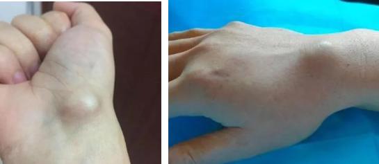 腱鞘囊腫的病因是長期炎癥刺激、慢性勞損導(dǎo)致關(guān)節(jié)囊、韌帶、腱鞘中的結(jié)締組織發(fā)生退行性粘液性變性,從而形成囊性腫物?;颊叨酁榍鄩涯辏愿嘁?。腱鞘囊腫常呈半球形,隆起于皮下,生長緩慢,大小不一,一般不超過2cm,偶爾也可達8cm。囊腫大小與癥狀輕重?zé)o直接關(guān)系,而與囊腫張力有關(guān),張力越大,腫物越硬,疼痛越明顯。