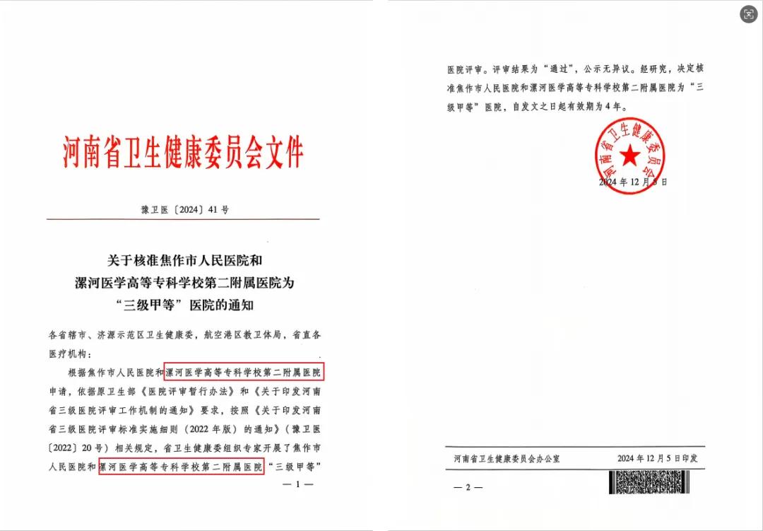 從1949年到2024年,漯河醫(yī)專第二附屬醫(yī)院(漯河市骨科醫(yī)院、漯河市立醫(yī)院)走過了75載不平凡的發(fā)展歷程。時值醫(yī)院建院75周年之際,喜報傳來:經(jīng)河南省衛(wèi)生健康委“三級甲等醫(yī)院”評審和公示,決定核準(zhǔn)漯河醫(yī)學(xué)高等??茖W(xué)校第二附屬醫(yī)院為“三級甲等”醫(yī)院!