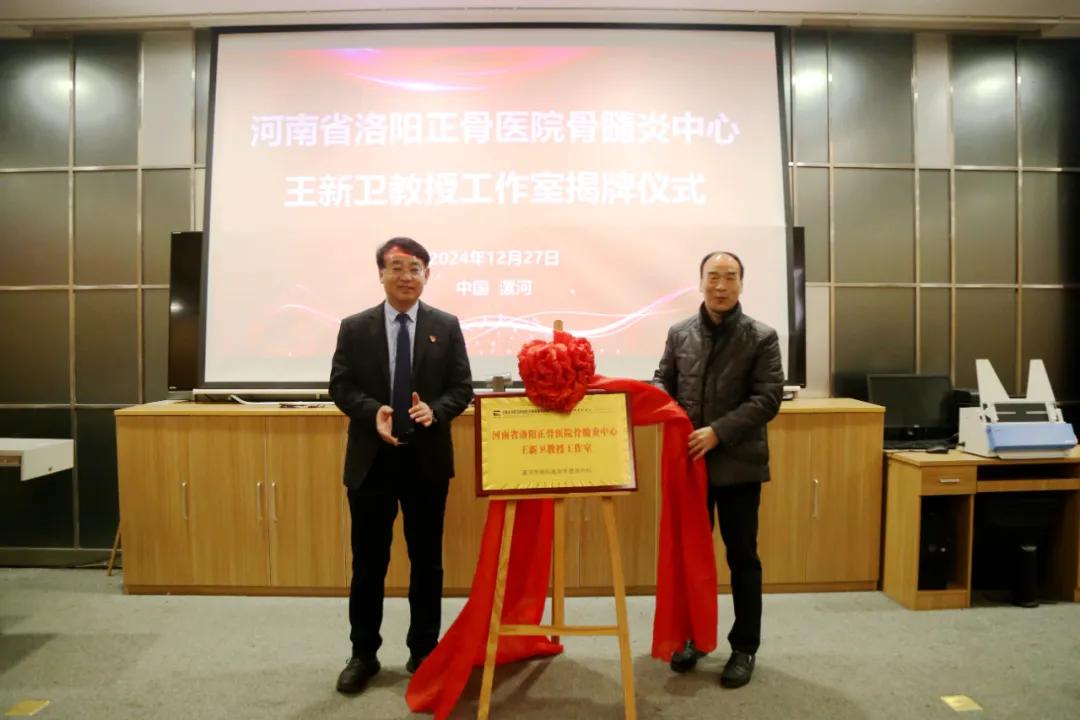 洛陽正骨醫(yī)院骨與關節(jié)感染診療中心主任王新衛(wèi)教授、漯河市骨科醫(yī)院黨委書記柴運洪共同為河南省洛陽正骨醫(yī)院王新衛(wèi)教授工作室揭牌。
