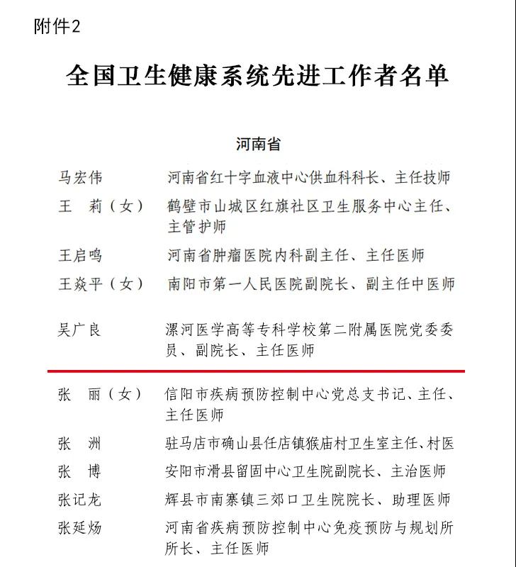 漯河醫(yī)專二附院吳廣良教授榮獲“全國衛(wèi)生健康系統先進工作者”稱號