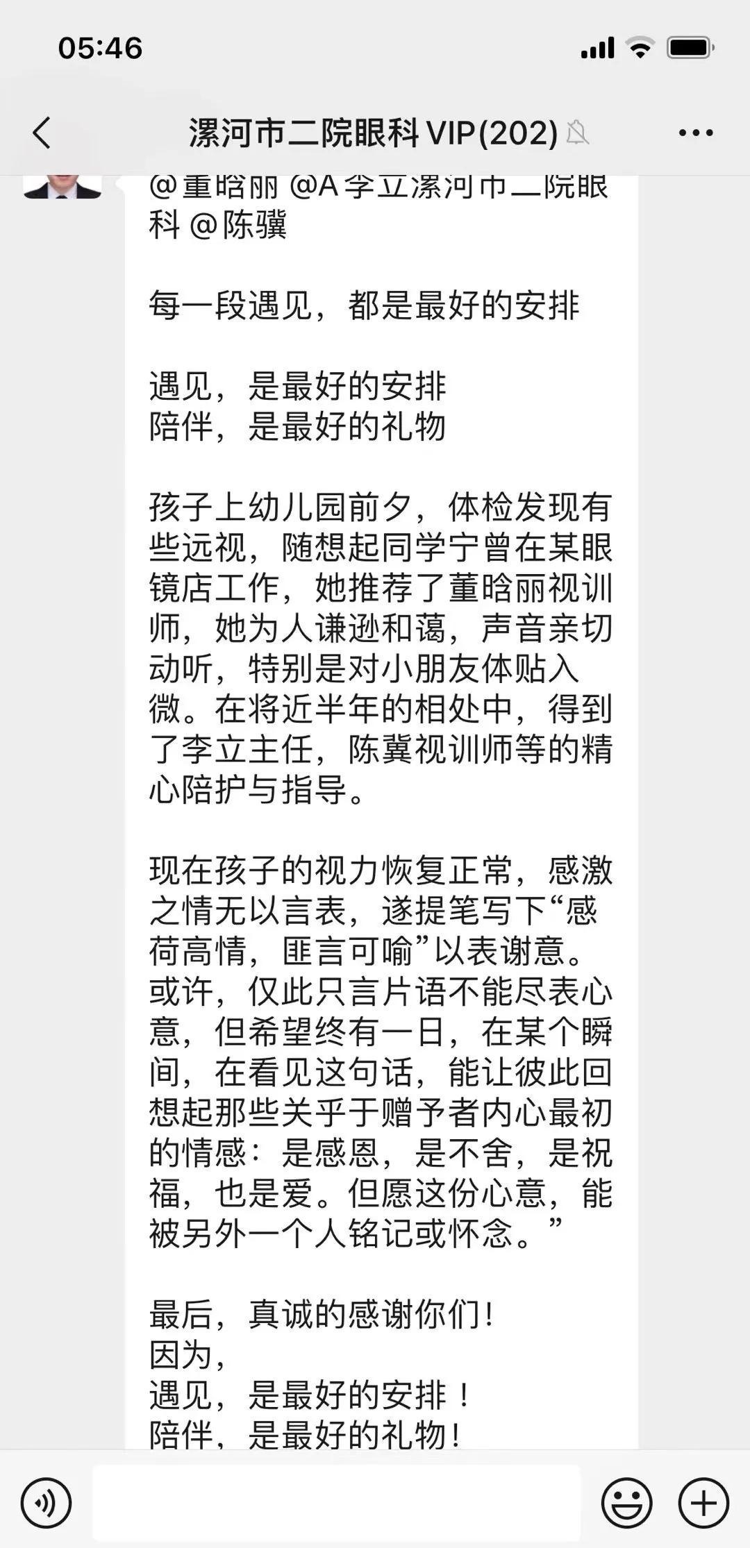 孩子上幼兒園前夕,體檢發(fā)現(xiàn)有些遠(yuǎn)視,想起同學(xué)寧曾在某眼鏡店工作,她推薦了董晗麗視訓(xùn)師,她為人謙遜和藹,聲音親切動(dòng)聽,特別是對(duì)小朋友體貼入微。在將近半年的相處中,得到了李立主任,陳冀視訓(xùn)師等的精心陪護(hù)與指導(dǎo)。