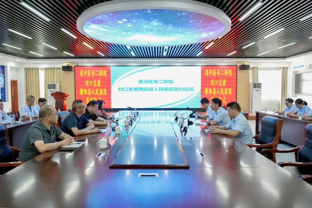 7月1日,在舞陽縣人民醫(yī)院會議室舉行漯河醫(yī)專二附院對口支援舞陽縣人民醫(yī)院協(xié)議書簽訂儀式。漯河醫(yī)專二附院黨委書記柴運洪、副院長鄭建新、醫(yī)務科主任徐向峰,舞陽縣衛(wèi)健委副主任楊云峰、婦幼股股長張艷麗,舞陽縣人民醫(yī)院黨委委員、副院長魏廷舉、醫(yī)務科科長馬瓊,以及兩院專家代表共同出席。