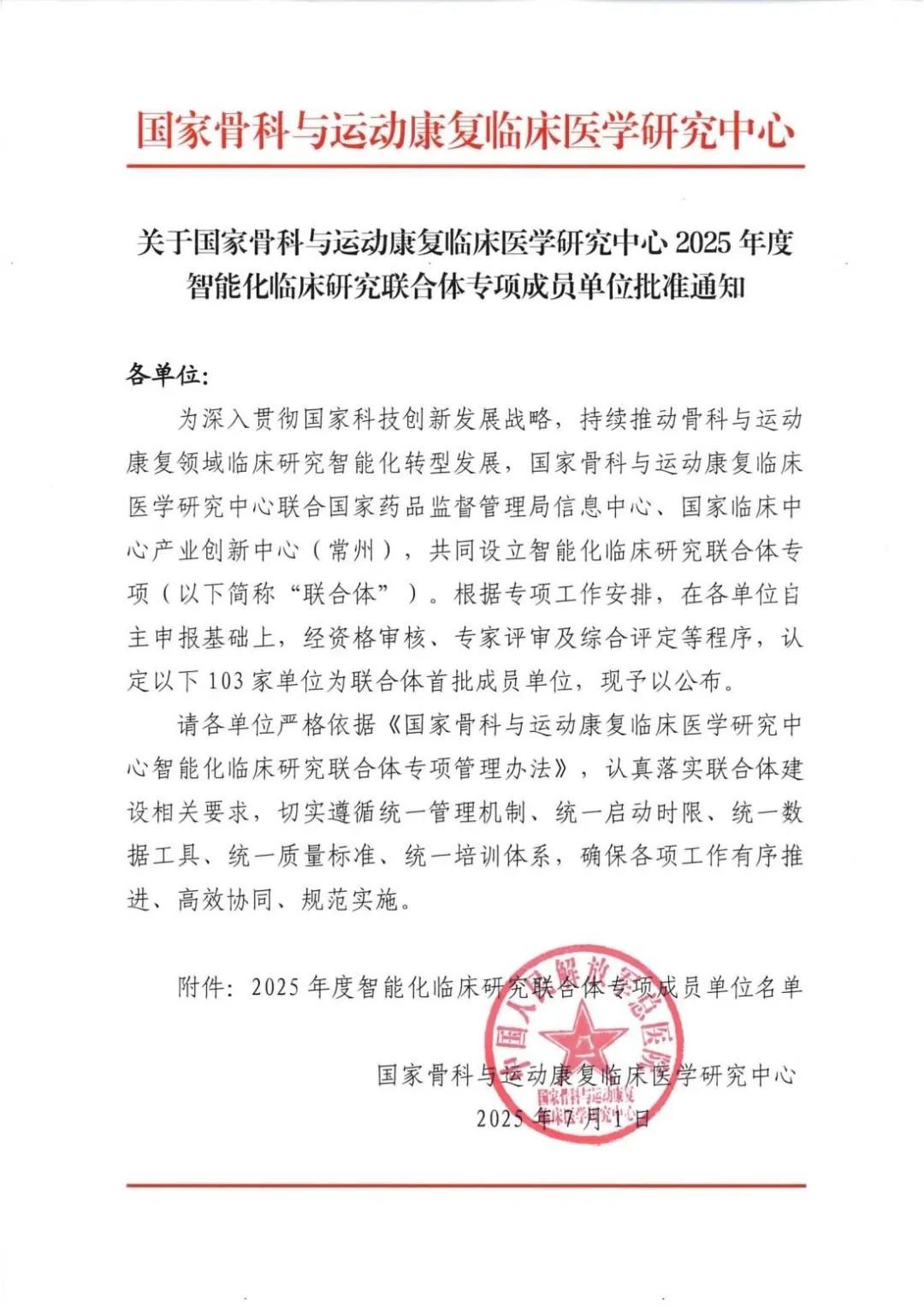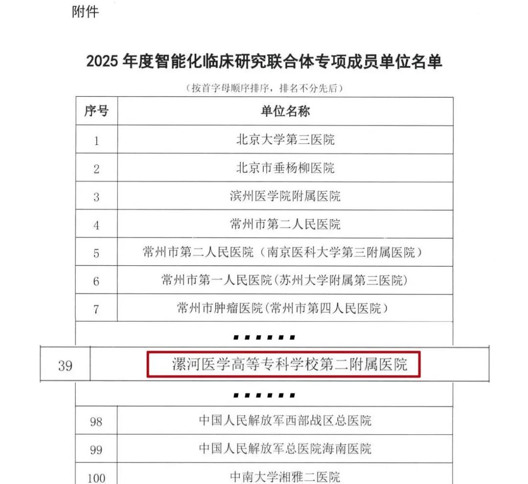由國家骨科與運(yùn)動(dòng)康復(fù)臨床醫(yī)學(xué)研究中心(以下簡稱“國家臨床中心”)聯(lián)合國家藥品監(jiān)督管理局信息中心、國家臨床中心產(chǎn)業(yè)創(chuàng)新中心(常州)共同設(shè)立的“2025年度智能化臨床研究聯(lián)合體專項(xiàng)”已完成首批成員單位遴選,共103家單位成功入選(具體名單見文末附件),覆蓋全國26個(gè)省份。 其中漯河醫(yī)專二附院成功入選國家臨床中心“智能化臨床研究聯(lián)合體專項(xiàng)”首批成員單位