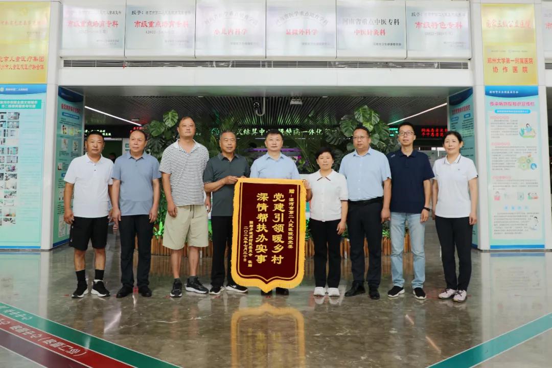 7月30日上午,臨潁縣固廂鄉(xiāng)城頂村黨支部書記楊勝武帶領村“兩委”干部,代表全體村民專程來到市二院,將一面飽含深情的錦旗送到院黨委書記魏松,黨委副書記、院長胡海英手中,以此感謝市二院及派駐第一書記在駐村幫扶中給予的堅定支持和為村里帶來的實際變化。