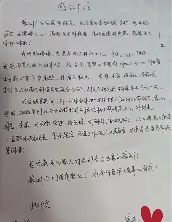 這封感謝信,是對普通外科全體醫(yī)護人員,尤其是對護理團隊辛勤付出和專業(yè)精神的高度認可與鼓勵。對團隊而言,患者的康復和家屬的滿意是他們最大的追求。普通外科團隊將繼續(xù)秉承“以患者為中心”的服務理念,不斷精進醫(yī)療技術,提升護理服務質(zhì)量,尤其是加強復雜、高齡患者圍手術期的精細化、人性化護理管理,用精湛的醫(yī)術祛除病痛,用溫暖的仁心守護健康,為更多患者帶來康復的希望和家的溫暖。(盧 闖 閆紅麗 劉 旭 袁錦鈺)