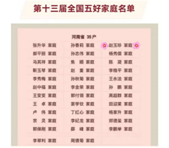 5月15日,全國(guó)婦聯(lián)表彰997戶全國(guó)五好家庭,鄭州市3戶家庭上榜,高新區(qū)石佛辦事處趙玉珍家庭獲得第十三屆“全國(guó)五好家庭”榮譽(yù)稱號(hào)。