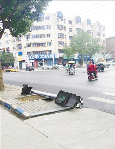 昨日上午9時許,記者趕到建設(shè)路與泰山路交叉口,看到路邊有個被撞倒的紅綠燈設(shè)備。