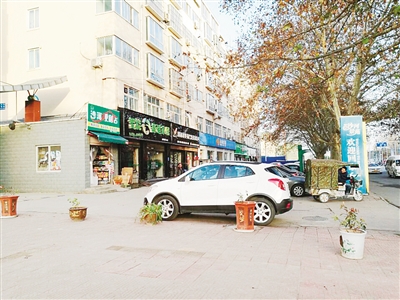 在擺放的花盆另一側(cè),有用白線劃定的幾個停車位,而在車位頂端的一條線上,也擺了一排花盆,用來防止車輛??俊S浾咦⒁獾?,有了花盆阻擋,幾輛汽車和電動車只能??炕ㄅ枞Χǚ秶酝獾穆访嫔稀?br />