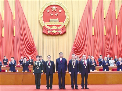 在雄壯的《向祖國英雄致敬》樂曲聲中,習(xí)近平為國家勛章和國家榮譽稱號獲得者一一頒授勛章獎?wù)?,并同他們親切握手、表示祝賀。隨后,4位國家勛章和國家榮譽稱號獲得者受邀到主席臺就座。全場響起一陣陣熱烈的掌聲。