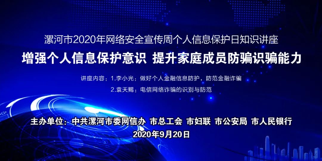為推動漯河市網(wǎng)絡(luò)安全宣傳周個人信息保護(hù)日主題活動深入開展,結(jié)合生活中個人金融信息、電信信息容易被竊取的問題,幫助廣大家庭成員提升金融詐騙、電信網(wǎng)絡(luò)詐騙的防騙識騙能力,中共漯河市委網(wǎng)信辦、市總工會、市婦聯(lián)、市公安局、市人民銀行聯(lián)合舉辦“保護(hù)個人信息安全、提升防騙識騙能力”直播授課。