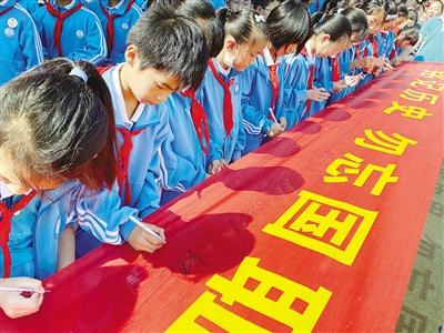 “九一八”來臨之際,萬祥街小學(xué)組織全體師生開展了以“銘記歷史 勿忘國恥 居安思危 強(qiáng)我中華”為主題的系列紀(jì)念活動。圖為同學(xué)們在橫幅上簽名。朱亞如 攝