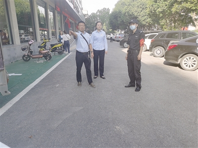 吳國安(左一)正在指導(dǎo)門前車輛擺放。