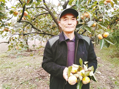 袁玉德拿著剛摘下來(lái)的柿子向記者介紹。