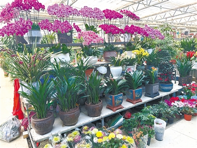 隨后,記者到柳江路金三角花卉市場(chǎng)采訪。市場(chǎng)內(nèi),蝴蝶蘭、發(fā)財(cái)樹、長(zhǎng)壽花等顏色明艷、寓意吉祥的花卉被擺在顯眼位置。人們?nèi)宄扇?,在花卉綠植間穿梭、選購。除了鮮花、綠植,一些做工精美、寓意美好的仿真花卉和用仿真花飾做成的福桶也很受歡迎。“福桶是最近幾年興起的,以紅色為主基調(diào),非常喜慶,適合春節(jié)擺在家中,深受消費(fèi)者喜愛。”店主駱先生介紹。