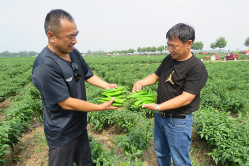 圖為石拐村黨支部書記、臨潁縣自安種植專業(yè)合作社負(fù)責(zé)人邢自安(右)石拐村第一書記張釗(左)在辣椒基地查看今年的辣椒長勢、辣椒品質(zhì)時的情景。