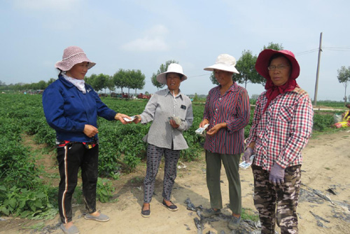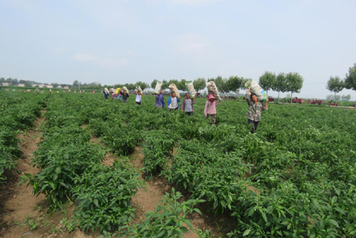 圖為臨潁縣王孟鎮(zhèn)石拐村自安產(chǎn)業(yè)扶貧基地的社員們,在辣椒基地采摘辣椒時的情景。