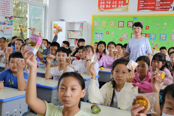 第二部分是“濃情相伴、愛在中秋”中秋節(jié)分享會活動。同學(xué)們朗誦著歌頌中秋節(jié)的古詩、唱著中秋節(jié)的歌曲。伴隨著“月餅圓圓甜又香……”的歌聲,分享會開始啦,瞧!每個孩子的臉上都綻放著開心的笑容,孩子們將帶來的月餅、零食整齊地?cái)[放在餐盤里,相互觀賞著,接著紛紛介紹:“我的月餅是圓形的,是草莓味的。”“我的月餅是正方形的,是豆沙味道的。”“我的蘋果可甜了。”“我還帶了火腿腸……”通過小組合作,孩子們把愛心家長自愿提供的月餅,獻(xiàn)給敬愛的老師、親愛的同學(xué)們!同學(xué)們你喂我一口,我吃你一塊兒,開心極了!孩子們分享著月餅,更分享著快樂……千言萬語,道不盡孩子們的聲聲祝福,傳統(tǒng)文化,洗禮著一顆顆幼小的心靈。整個校園沉浸在濃濃節(jié)日氛圍之中?;顒釉谳p松愉悅的氣氛中圓滿落下帷幕,孩子們度過一個意義非凡,情伴中秋的主題活動日,收獲滿滿。