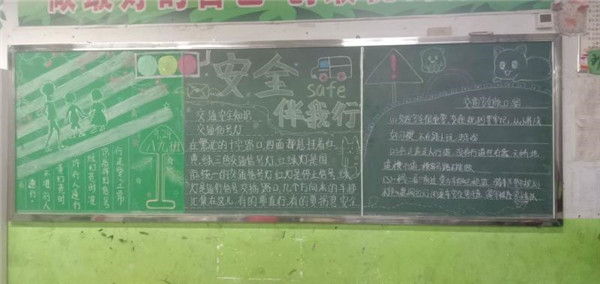 各班通過學(xué)生自主搜集材料,自主設(shè)計(jì)創(chuàng)作“安全伴我行”黑板報(bào),再一次向每個(gè)中學(xué)生敲響安全警鐘,徹底遠(yuǎn)離交通危險(xiǎn)!各級各班將交通安全知識生動形象或?qū)懟虍嬙诤诎迳?。其?nèi)容生動有趣,色彩紛呈,精巧別致,醒目大方。體現(xiàn)了知識性、趣味性與實(shí)用性的統(tǒng)一。有效地加強(qiáng)了學(xué)生交通安全防范意識,使學(xué)生掌握了必備的交通安全知識,時(shí)刻牢記自覺遵守交通法規(guī)。