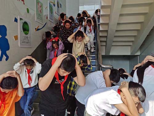 上午9:50,各班老師對(duì)學(xué)生進(jìn)行防震知識(shí)講解,然后對(duì)演練過(guò)程、疏散路線、存在問(wèn)題做了詳細(xì)要求,確保做到活動(dòng)安全。10點(diǎn)整,演練正式開始,警報(bào)聲響起,各班按照學(xué)校防震演練預(yù)案要求,立即關(guān)閉電源,沉著冷靜指揮學(xué)生緊急避險(xiǎn),指導(dǎo)學(xué)生迅速抱頭、閉眼,躲在桌下,盡量蜷曲身體,降低身體重心,并盡可能保護(hù)頭部,學(xué)生也井然有序的利用課桌、書包等有效地進(jìn)行自護(hù)。隨著警報(bào)聲結(jié)束,老師迅速組織學(xué)生有序撤離,學(xué)生用手保護(hù)頭部,分別從教學(xué)樓的東西樓梯進(jìn)行撤離,快速跑向操場(chǎng)集合,全校師生500余人,從教學(xué)樓跑到操場(chǎng)共計(jì)用時(shí)1分鐘30秒,此次演練順利完成。演練結(jié)束后,副校長(zhǎng)劉國(guó)琴季給同學(xué)們講解了地震、消防安全知識(shí),并對(duì)本次安全疏散演練進(jìn)行了總結(jié)。