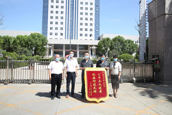 8月25日上午,順河街建西社區(qū)黨支部書記、居委會(huì)主任梁三閣、牛行街小區(qū)業(yè)委會(huì)主任時(shí)勝濤將印有“公平正義使者,抗疫防疫先鋒”的錦旗送到市法院,代表社區(qū)工作人員和社區(qū)居民對(duì)市法院在社區(qū)疫情防控工作中給予的大力支持表示感謝。