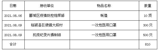 截止到8月16日20時,漯河市新冠肺炎疫情防控指揮部累計收到社會捐贈款物價值13,661,498.4元,其中捐贈物資價值5,575,623.88元,現(xiàn)將接受社會捐贈款物支出分配情況公示如下: