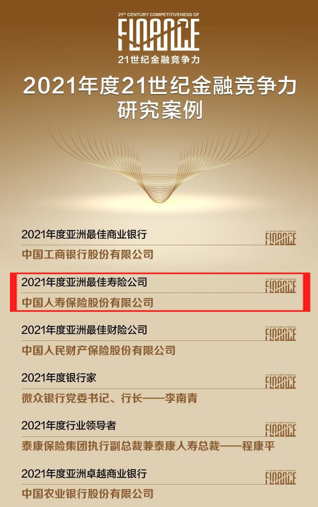 11月2日,第十六屆亞洲金融年會(huì)保險(xiǎn)論壇在北京成功舉辦,21世紀(jì)亞洲金融競(jìng)爭(zhēng)力研究案例同步揭曉。中國人壽保險(xiǎn)股份有限公司(以下簡(jiǎn)稱“中國人壽壽險(xiǎn)公司”)榮獲“2021年度亞洲最佳壽險(xiǎn)公司”大獎(jiǎng)。