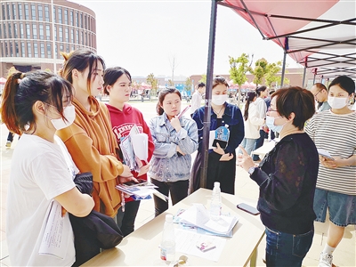 “我們公司位于臨潁縣經(jīng)濟技術(shù)開發(fā)區(qū),是國家級高新技術(shù)企業(yè),今年生產(chǎn)規(guī)模進一步擴大,需要更多優(yōu)秀的專業(yè)技術(shù)人才,感興趣的同學(xué)請?zhí)钜幌虑舐氁庀虮怼?rdquo;漯河建泰精密科技有限公司展位前,董事長助理曹芹英熱情地向求職者介紹公司和招聘崗位情況。