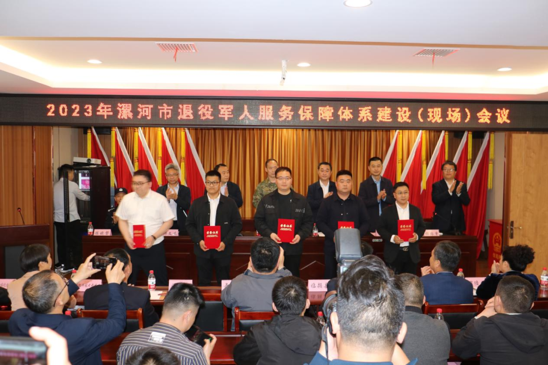 與會(huì)領(lǐng)導(dǎo)共同為漯河市首屆“十佳”退役軍人服務(wù)站站長頒發(fā)榮譽(yù)證書。