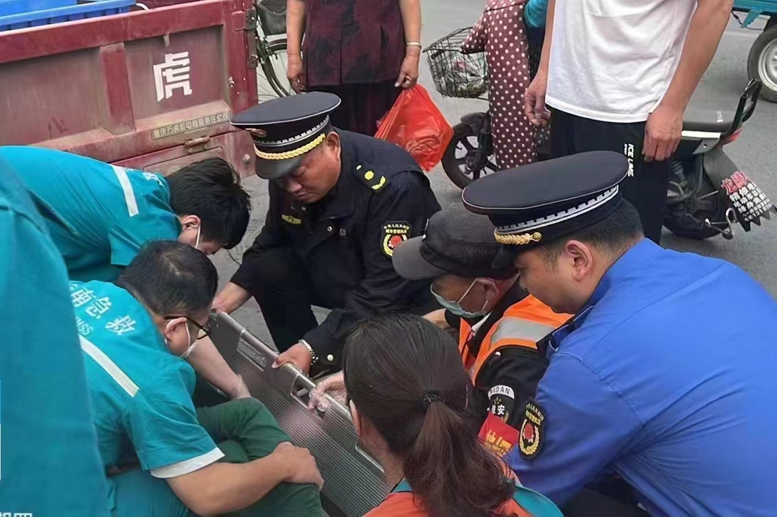 老人在街上散步,其前面剛好有一輛三輪車。三輪車主人出現(xiàn)視線死角,沒有看到身后的老人,在進(jìn)行倒車操作時(shí)不慎將其撞倒,盡管及時(shí)停車了,老人還是重重的摔倒在地,情況緊急,趙東祥見狀毫不猶豫撥打了家屬和救助電話,待救護(hù)車趕到后,幫忙將老人小心翼翼抬至擔(dān)架送上車輛,在場的大家這才松口氣,他們又繼續(xù)投入到的執(zhí)勤工作中。雖然偶遇突發(fā)事件,但是受降路農(nóng)貿(mào)市場的隊(duì)員們,他們用實(shí)際行動(dòng)詮釋了“執(zhí)法為民”的職業(yè)美德,也會(huì)一直將執(zhí)法為民的理念融入到日常工作中,向社會(huì)傳遞城管正能量。(樊力 唐田)