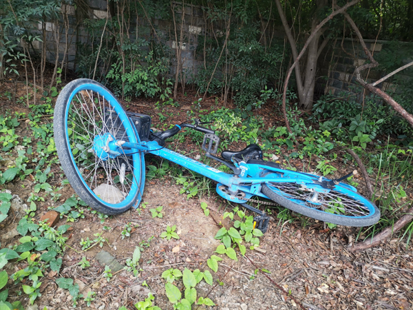 7月20日,在澧河斜拉橋附近公園,有共享單車亂扔亂放行為。