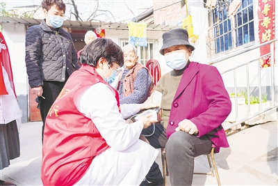 志愿者為老人測量血壓。圖片由新華街社區(qū)提供