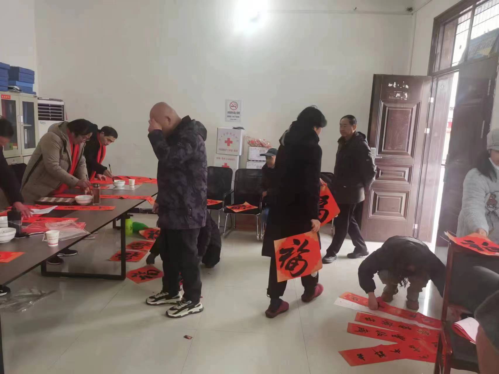 雖然天氣寒冷、雪花飛舞,但村黨群活動中心卻格外熱鬧,四位書法家擺開長桌,鋪開紅紙,揮毫潑墨、下筆如飛,連續(xù)書寫近四個小時,一副副散發(fā)著清新墨香的春聯(lián)隨筆而生,一張張情意濃濃的“福”字蘸墨而成。村民們圍聚在一起,春聯(lián)一寫好就被人取走,絡(luò)繹不絕,爭先恐后,翰墨飄香,現(xiàn)場一片喜氣洋洋、暖意融融的新年氛圍。