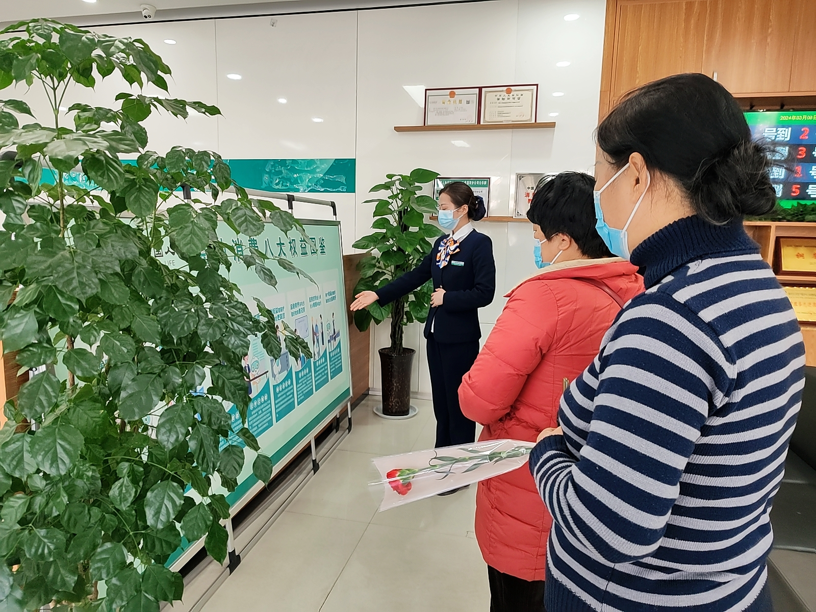 活動(dòng)當(dāng)天營業(yè)廳為到場(chǎng)的女性客戶獻(xiàn)上康乃馨,表達(dá)節(jié)日的問候和祝?!,F(xiàn)場(chǎng)推出了消保知識(shí)競猜活動(dòng),參加活動(dòng)的客戶從鮮花墻上抽題答題并贈(zèng)送了禮品,不僅活躍了節(jié)日氣氛,又為客戶普及了金融消費(fèi)者權(quán)益知識(shí),提高客戶風(fēng)險(xiǎn)防范意識(shí)。