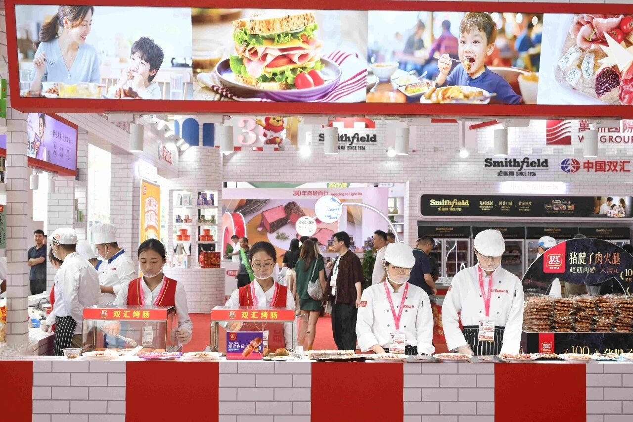 雙匯展廳內(nèi)的展品琳瑯滿目、品類豐富,我們可以看到企業(yè)對肉類美食的探索,早已從“一支火腿腸”拓展出更多可能。僅肉制品就涵蓋了簡頌午餐肉、金沙蛋黃腸、豬腱子肉火腿、富樂鹵味腸等特色產(chǎn)品系列,焦香蜜汁腸、塞納諾火腿、山核桃木煙熏原切培根、薩納齊瓊香腸等史蜜斯系列,玉米肉棗腸、脆骨肉條香腸、火爆小郡肝等匯小鋪零食系列,鹵福齋中式產(chǎn)品禮盒系列,招牌面、香菇雞丁米線、酸辣粉等方便速食系列。