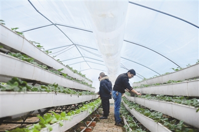 秸稈反應(yīng)堆技術(shù)是源匯區(qū)食品安全監(jiān)督大隊在精準(zhǔn)扶貧過程中幫助群眾引入的。王新華帶記者進入基地的塑料大棚,一入棚,排排立體種植的草莓就呈現(xiàn)眼前。舒展的草莓葉子充滿盈盈綠意,其間怒放著朵朵小白花。與一般的塑料大棚不同的是,草莓上面的棚架上固定有兩條塑料薄膜制成的“長龍”,里面充滿氣體。“長龍”貫穿大棚兩端,“龍身”上扎有一個一個的孔。王新華對記者說:“這兩條‘長龍’是送氣筒,里面是落葉經(jīng)秸稈反應(yīng)堆技術(shù)處理后產(chǎn)生的二氧化碳氣體。”二氧化碳的氣源,是大棚一端的秸稈反應(yīng)堆。正在忙著為秸稈反應(yīng)堆打孔的陳小甫是大劉鎮(zhèn)前陳村村民,經(jīng)過一段時間的操作,他儼然成了秸稈反應(yīng)堆技術(shù)方面的行家里手。“這一種是‘內(nèi)置秸稈生物反應(yīng)堆’,其實就是把我們以前焚燒掉的玉米秸稈、樹葉等通過發(fā)酵,使它們轉(zhuǎn)化成蔬菜、瓜果所需要的二氧化碳。發(fā)酵過程中,還能為冬季蔬菜生長提供大量的熱量,促進蔬菜生長。使用秸稈生物反應(yīng)堆技術(shù)后,可以不施化肥、不打農(nóng)藥,生產(chǎn)出來的瓜果蔬菜是典型的有機綠色食品。”