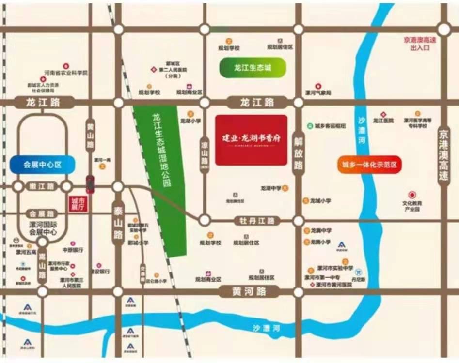 漯河牡丹江路與黃山路交會處(建業(yè)·龍湖書香府城市展廳)