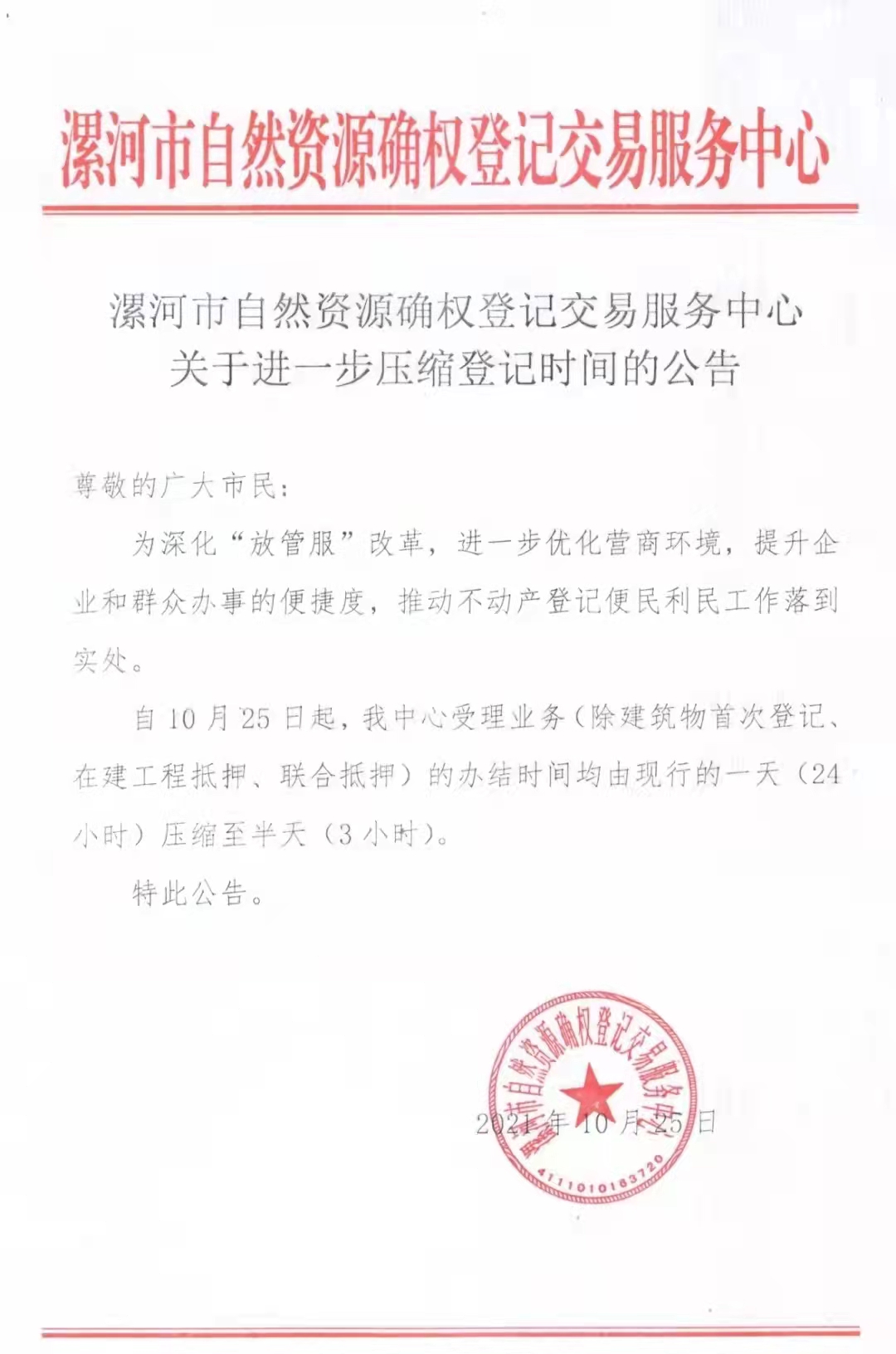 進一步優(yōu)化營商環(huán)境,提升不動產(chǎn)登記各項指標,提高辦事效率和服務質(zhì)量,漯河市自然資源確權登記交易服務中心刀刃向內(nèi),持續(xù)推進深化“放管服”改革,以提升服務能力作為工作的著力點,以提高群眾滿意度為出發(fā)點,主動再次壓縮辦理時限,為企業(yè)和群眾提供更加高效、優(yōu)質(zhì)、滿意的服務。自10月25日起,受理業(yè)務(除建筑物首次登記、在建工程抵押、聯(lián)合抵押)的辦結(jié)時間均由現(xiàn)在的24小時壓縮至3小時辦結(jié)。(通訊員:李文豪 李苗苗)