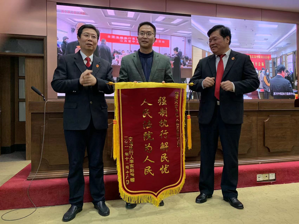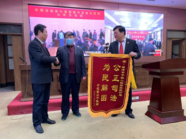 "感謝法院多方協(xié)調(diào)幫我解決了執(zhí)行老大難?。?拿到執(zhí)行款的當(dāng)事人董某激動(dòng)地展示一面錦旗表示謝意。根據(jù)最高院、省高院安排,11月18日上午,漯河市兩級(jí)法院舉行執(zhí)行案款集中發(fā)放活動(dòng)。漯河市中級(jí)人民法院黨組書記、院長(zhǎng)陳松林出席活動(dòng),并為當(dāng)事人發(fā)放案件執(zhí)行款。