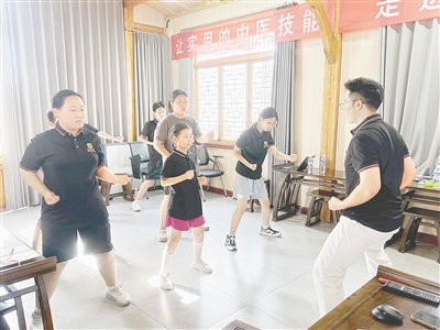目前正值暑假,知育學(xué)堂內(nèi)的青少年中醫(yī)夏令營(yíng)活動(dòng)正在進(jìn)行中。記者在夏令營(yíng)的活動(dòng)教室看到,十幾個(gè)孩子跟著老師練習(xí)八段錦。參加夏令營(yíng)的孩子們來(lái)自天津、河北、鄭州等。“我媽媽從河北開(kāi)車把我送到這里,主要是為了培養(yǎng)我對(duì)中醫(yī)的興趣,讓我了解如何調(diào)理自己的身體。”今年12歲的陳榮告訴記者。