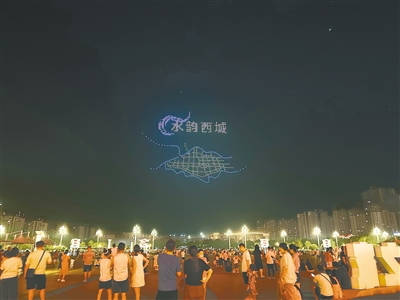 7月11日20時(shí),上千架無人機(jī)騰空而起,先組成“漯河味道”四字,轉(zhuǎn)瞬之間化作奔騰河流與展翅飛鳥,最終組成“水韻西城”字樣。“太壯觀了!”市民舉著手機(jī)驚呼,閃光燈與夜空中的光點(diǎn)交相輝映。市民之家南門前廣場(chǎng)成了光影的海洋。